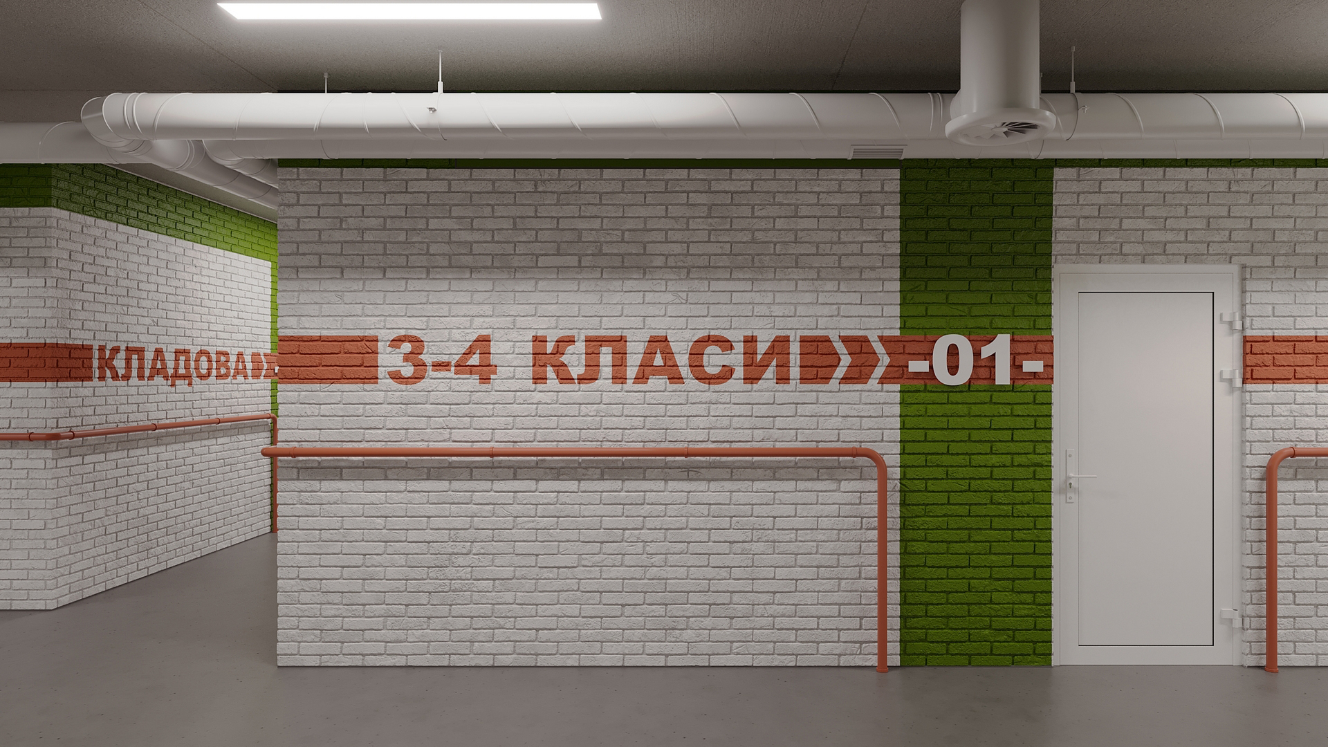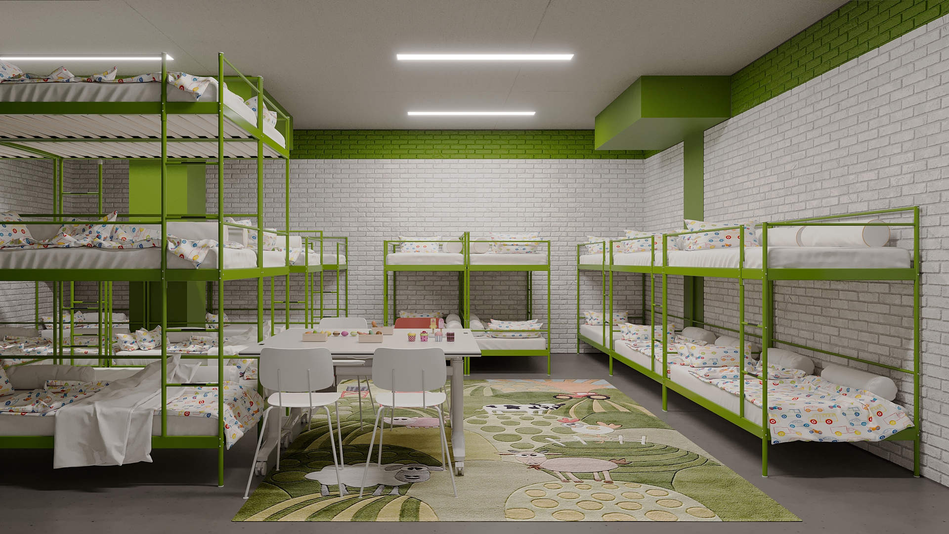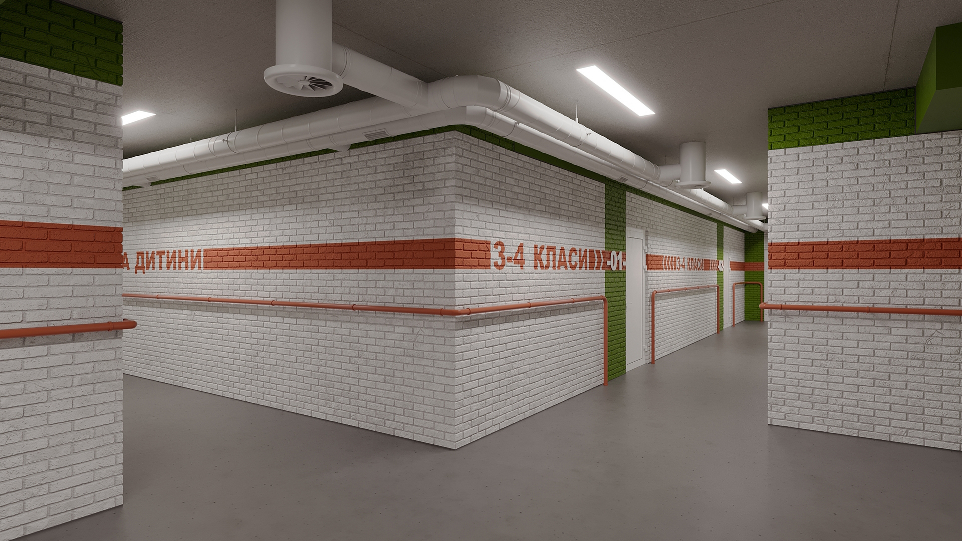 El interior del refugio está diseñado como si fuera una planta más de una escuela: con pasillos, aulas, salas de recreo, una sala para calentar y servir la comida y baños.